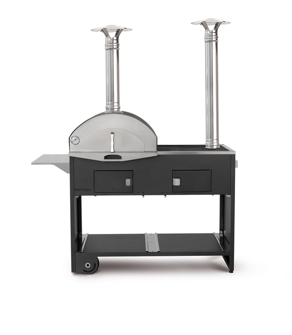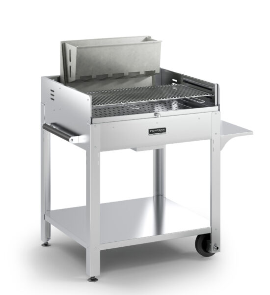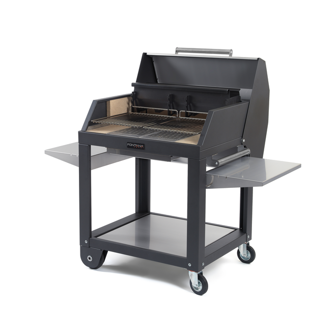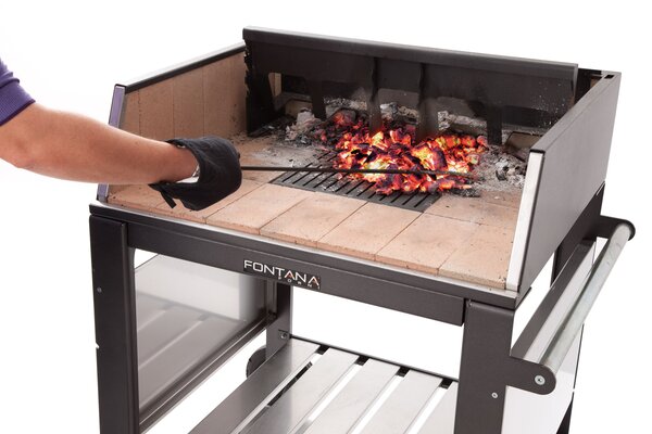 Die Portabilität des Grills Fontana ist sehr einfach dank dem Wagen mit 4 Rädern. Zwei davon sind schwenkend.