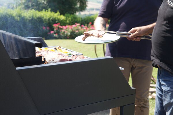 Die leckeren Gerichte im Zeichen der gastronomischen Tradition. Die große Feuerstelle erlaubt es, die notwendige Hitze für das Kochen zu produzieren und Fleisch senkrecht zu Garen. Nach der Anfeuerung befestigen Sie den Spieß und die Fettpfanne und legen kontinuierlich Holz nach. Geeignet für große Stücke und niedrige Temperaturen zum Garen und Kochen.